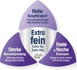 - KLONTVORMING: De extra fijne korrel is uiterst productief en vormt bijzonder platte klonten die het schoonmaken van de kattenbak vergemakkelijken