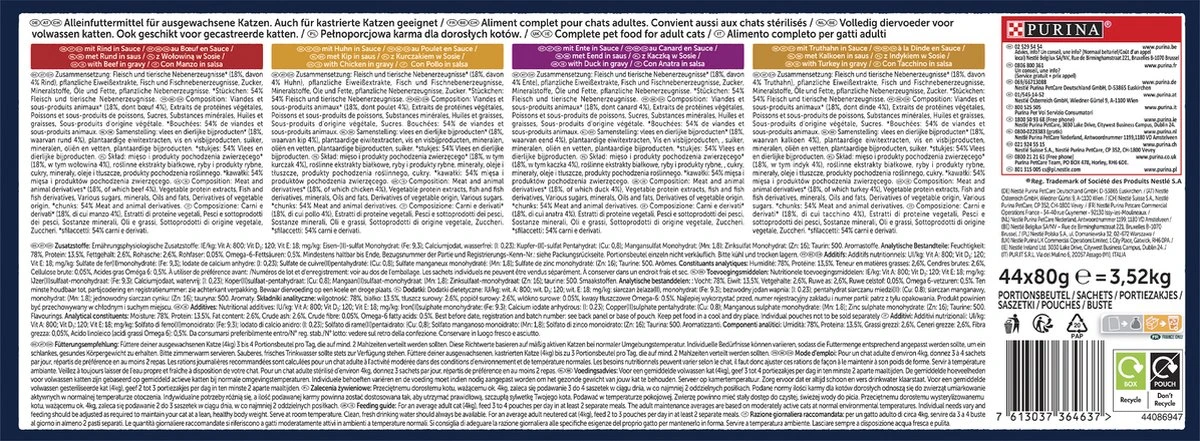 Felix Heerlijke Reepjes zijn malse en onweerstaanbare reepjes in een smakelijke jus waar jouw kat dol op zal zijn! Ze zien, ruiken en smaken heerlijk, net alsof je het zelf hebt klaargemaakt! Wanneer je jouw kat Felix Heerlijke Reepjes voert, weet je dat je hem iets geeft waar hij echt van houdt. Elk recept wordt precies op de juiste temperatuur bereid voordat het in malse reepjes wordt gesneden en in een onweerstaanbare saus wordt geserveerd. Ze vormen ook een bron van essentiele omega 6 vetzuren met de juiste combinatie van uitgebalanceerde vitaminen die jouw kat klaar zullen maken om nog meer kattenkwaad uit te halen. Ze zitten vol gezonde ingredienten om 100% te voldoen aan de dagelijkse behoeften van jouw kat indien gevoed volgens de voedingsrichtlijnen op de verpakking.