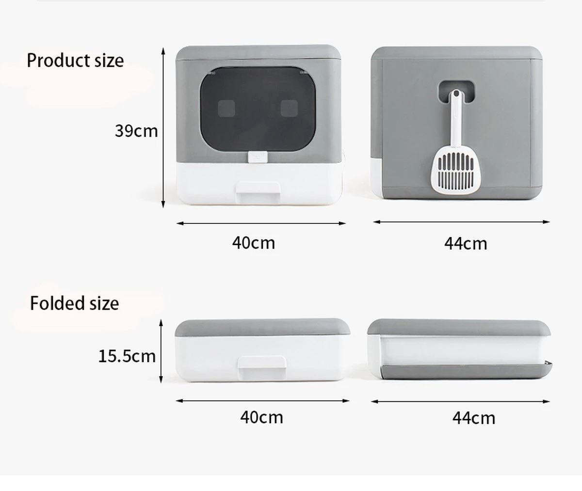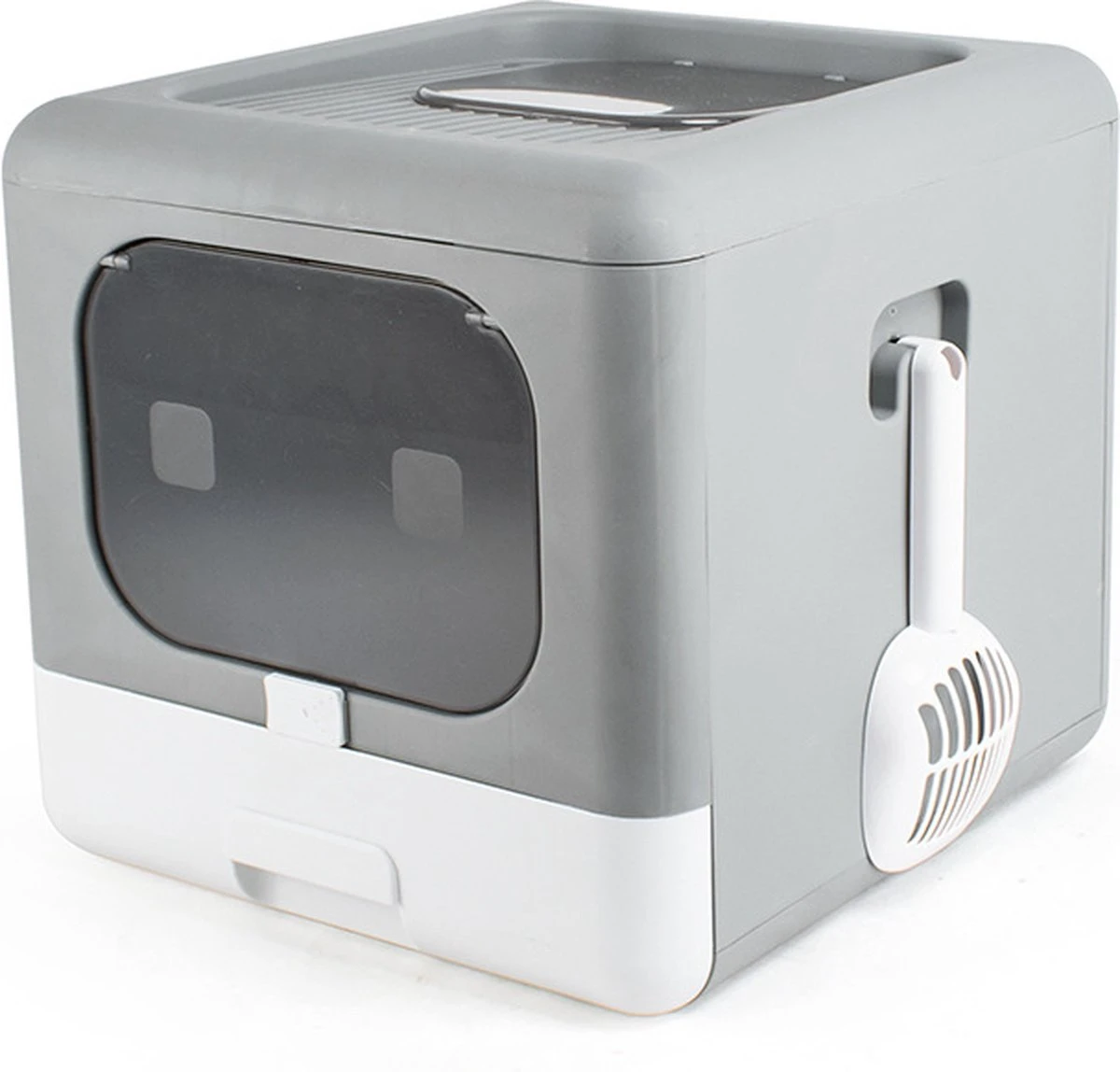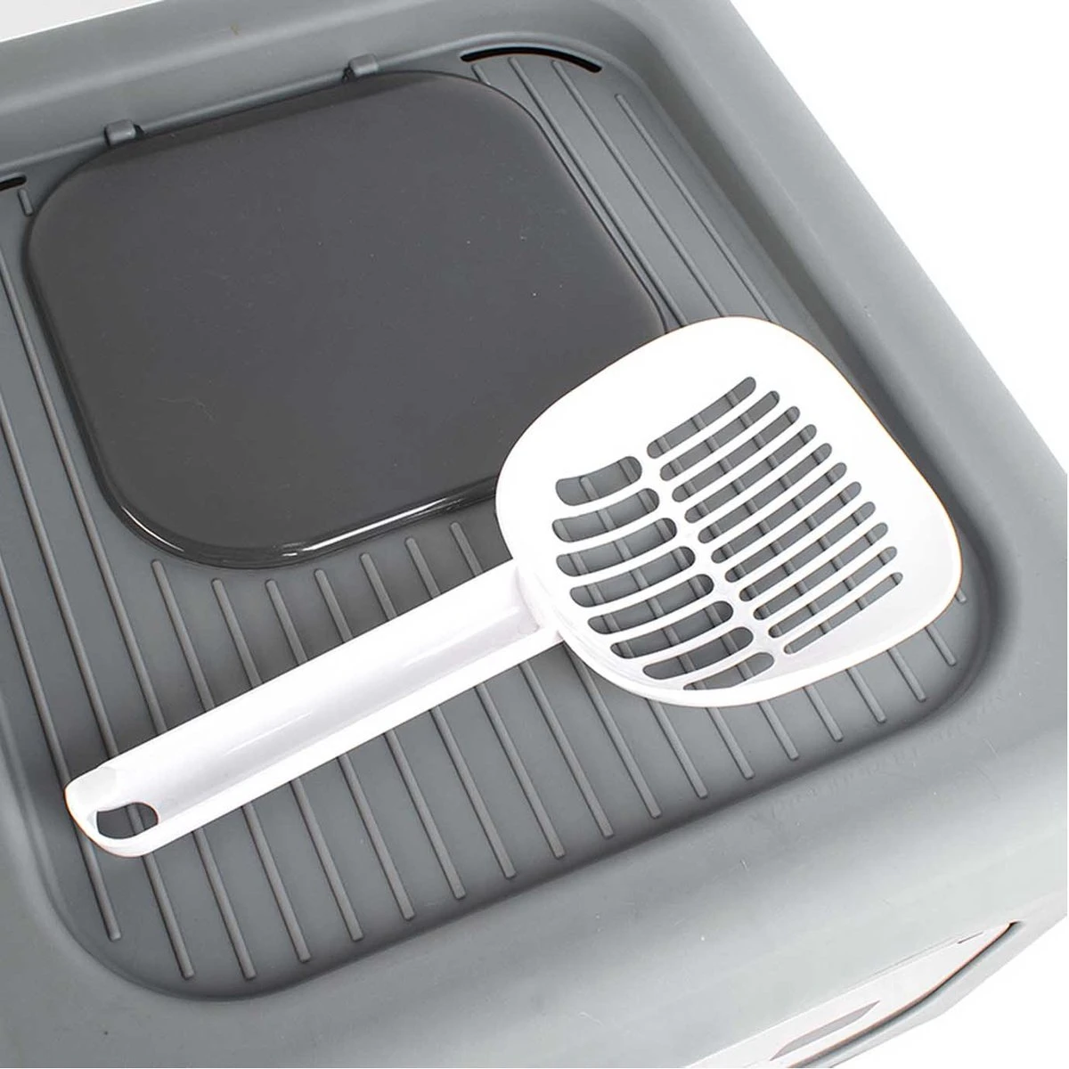 Deze kattenbak wordt geleverd met een schepje en een uitschuifbare lade om de kattenbak gemakkelijk schoon te kunnen maken.