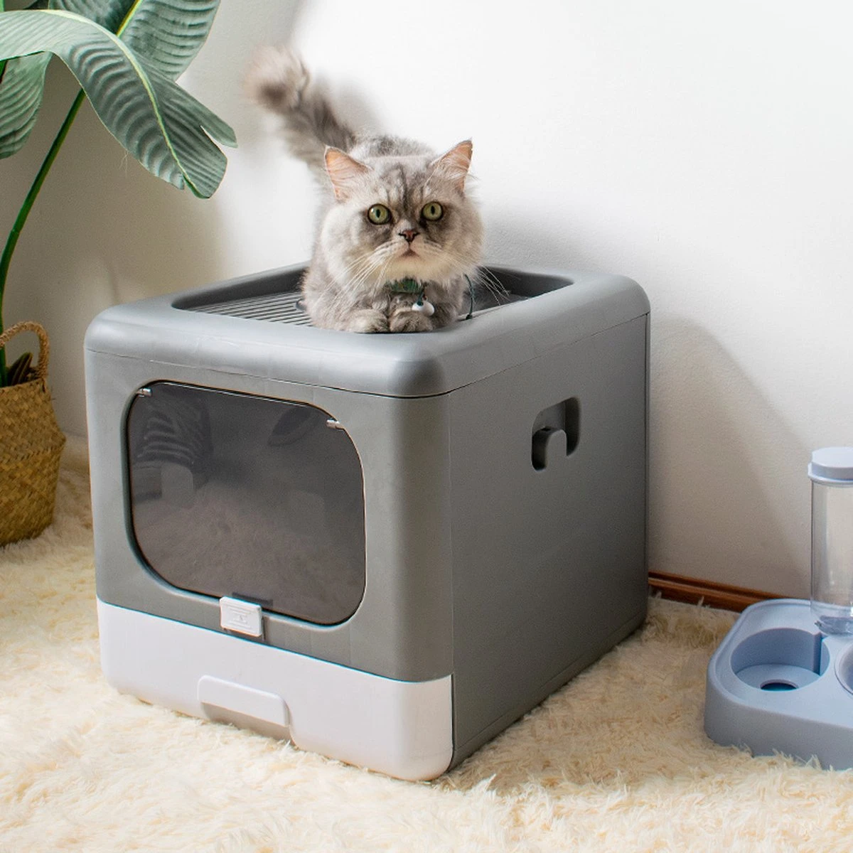Door het deurtje aan de voorkant komt jouw kat naar binnen. Aan de bovenkant bevindt zich een extra opening. Dit geeft meer bewegingsvrijheid voor je poes of kater en zorgt tegelijkertijd voor een andere uitgang. Eenmaal de kat bovenop de kattenbak staat, verliest hij of zij kattengrit dat tussen de teentjes is geraakt. De kattenstenen komen dus niet of nauwelijks meer jouw vloer.