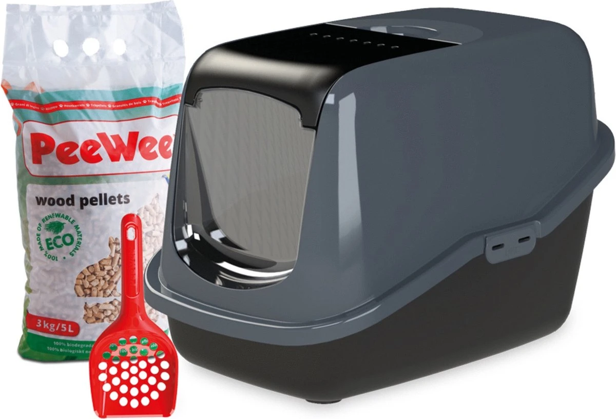 PeeWee EcoHûs gesloten kattenbak met koolstoffilter, kattenbakschep en 3kg PeeWee kattenbakkorrels.