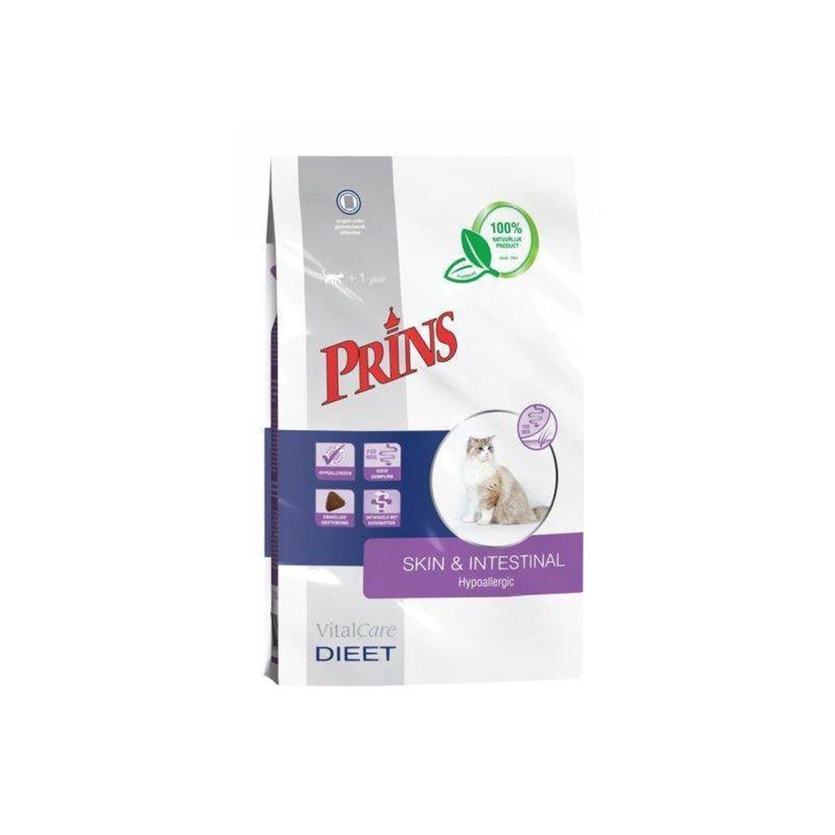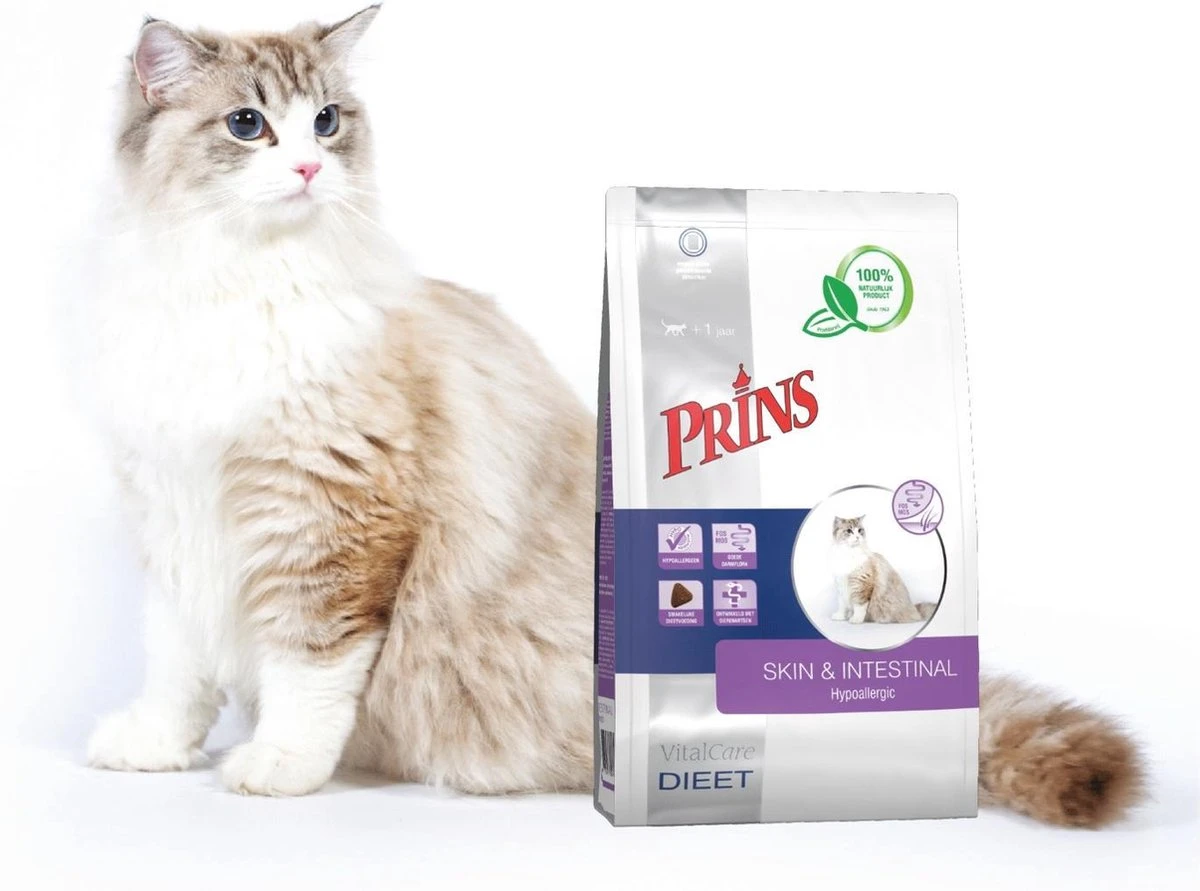 Uitsluitend verkrijgbaar in geselecteerde Pets Place winkels. Speciaal voor volwassen katten met een voedselovergevoeligheid (huid- en vachtproblemen) en/of ter ondersteuning van maagdarmproblemen (zoals diarree) heeft Prins Petfoods een speciale dieetvoeding ontwikkeld, namelijk: VitalCare dieet Skin & Intestinal Hypoallergic. Dit dieet bevat één eiwitbron en koolhydraatbron en vermindert de kans op een overgevoeligheidsreactie.Geselecteerde eiwitbronnen als eend en aardappel verminderen de kans op een overgevoeligheidsreactie. Katten met een overgevoeligheidsreactie kunnen last hebben van het maagdarmkanaal wat zich kan uiten in diarree. Voedingsvezels als Manno-Oligo-Saccharide (MOS) en Fructo-Oligo-Sacchariden (FOS) zorgen voor een evenwichtige gezonde darmflora. Daarnaast bevat de dieetvoeding zeer goed verteerbare ingrediënten welke zorgen voor een optimale opname van voedingsstoffen.