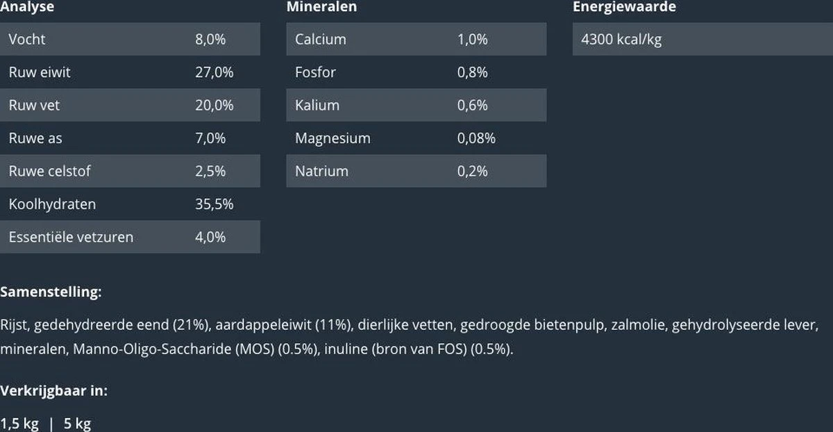 | Toevoegingsmiddelen | Mineralen<br />Calcium1,0%<br />Fosfor0,8%<br />Kalium0,6%<br />Magnesium0,08%<br />Natrium0,2% |
