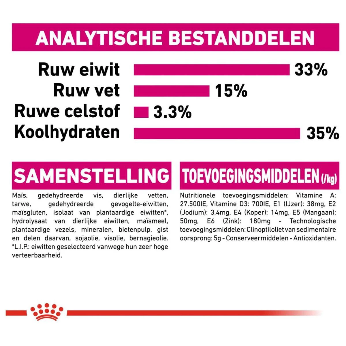 | Voedingswaarde | Samensteling: maïs, gedehydreerde vis, dierlijke vetten, gedehydreerde gevogelte-eiwitten, maïsgluten, isolaat van plantaardige eiwitten*, hydrolysaat van dierlijke eiwitten, maïsmeel, plantaardige vezels, mineralen, bietenpulp, gist en delen daarvan, sojaolie, visolie, bernagieolie |