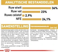 | Voedingswaarde | Samensteling: gedehydreerde gevogelte-eiwitten, rijst, dierlijke vetten, isolaat van plantaardige eiwitten*, maïs, hydrolysaat van dierlijke eiwitten, plantaardige vezels, bietenpulp, visolie, mineralen, sojaolie, Fructo-Oligo-Sacchariden, psylliumschil en psylliumzaden, hydrolysaat van gist (bron van Manno-Oligo-Sacchariden), bernagieolie, tagetes (Afrikaan) extract (bron van luteïne), hydrolysaat van schaaldieren (bron van glucosamine), hydrolysaat van kraakbeen (bron van chondroïtine) |